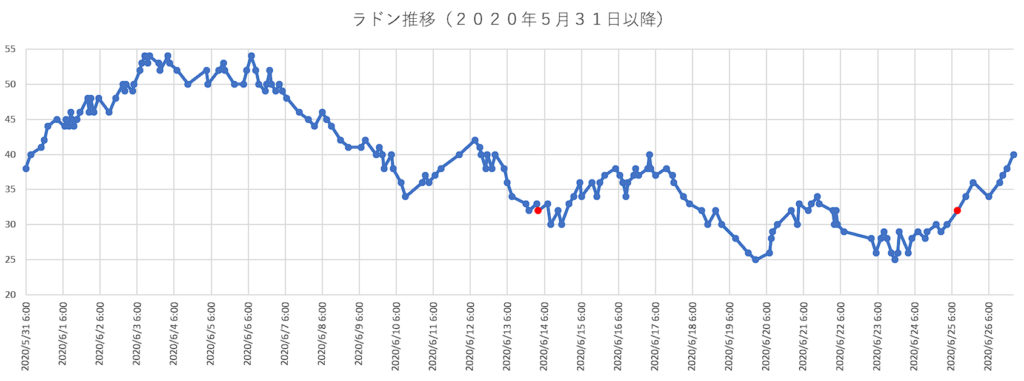 下記グラフは2020年6月のラドン数値推移グラフ。